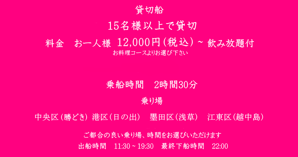 ※ご乗船人数が15名未満の場合でも、 15名様料金保証にて貸切出船致します。